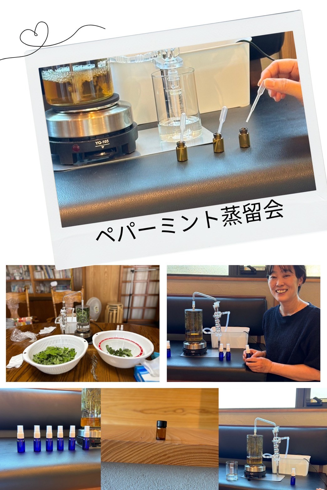 家庭用水蒸気蒸留器でいただいたペパーミントや庭で取れたゼラニウムなど、2日にわたり蒸留会を開催しました。