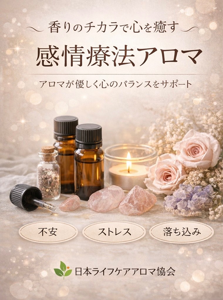 これは日本ライフケアアロマ協会が開発した独自の方法で、心と体のバランスを整えながら、あなたらしい人生を見つけるお手伝いができる療法なんです。